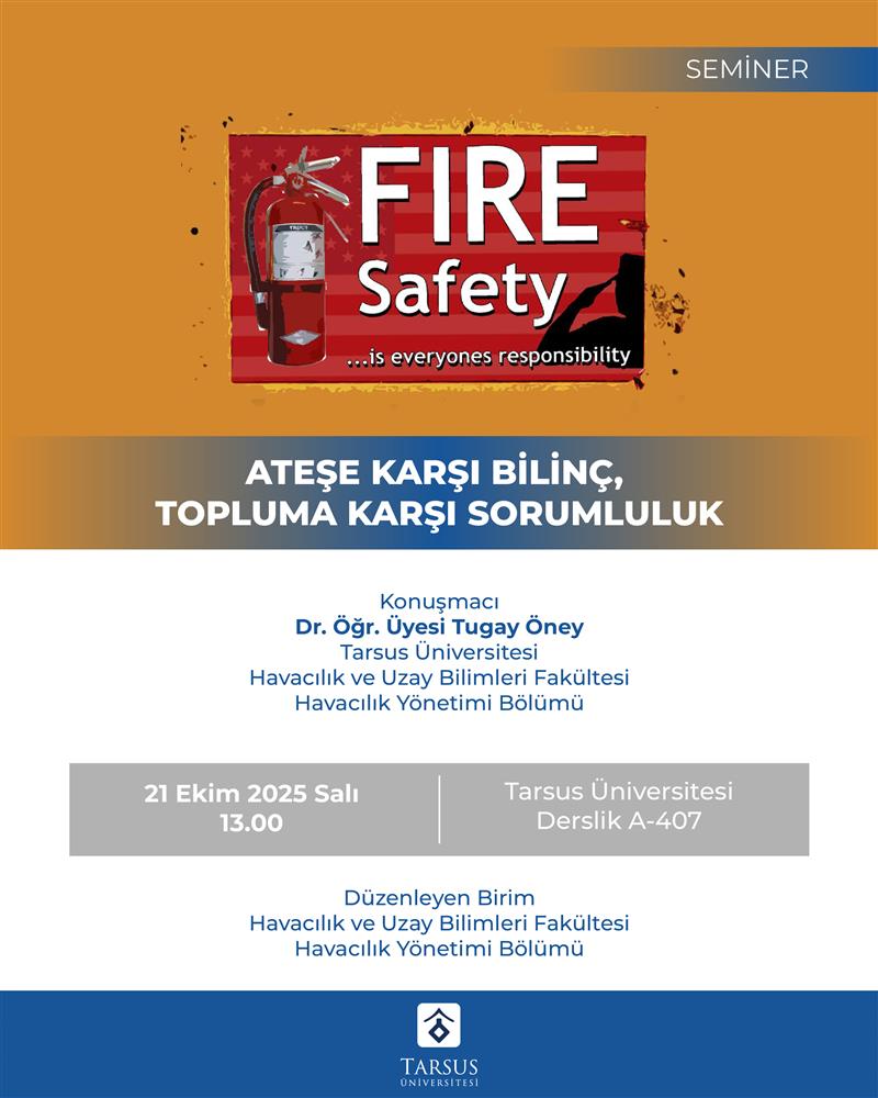 Bölümümüz öğretim elemanlarından Dr. Öğr. Üyesi Tugay Öney 21 Ekim 2025 Salı günü saat 13:00'da Havacılık ve Uzay Bilimleri Fakültesi A-407 nolu sınıfta "Ateşe Karşı Bilinç, Topluma Karşı Sorumluluk" adlı seminer verecektir. Etkinliğe tüm üniversite personeli ve öğrencilerimiz davetlidir.