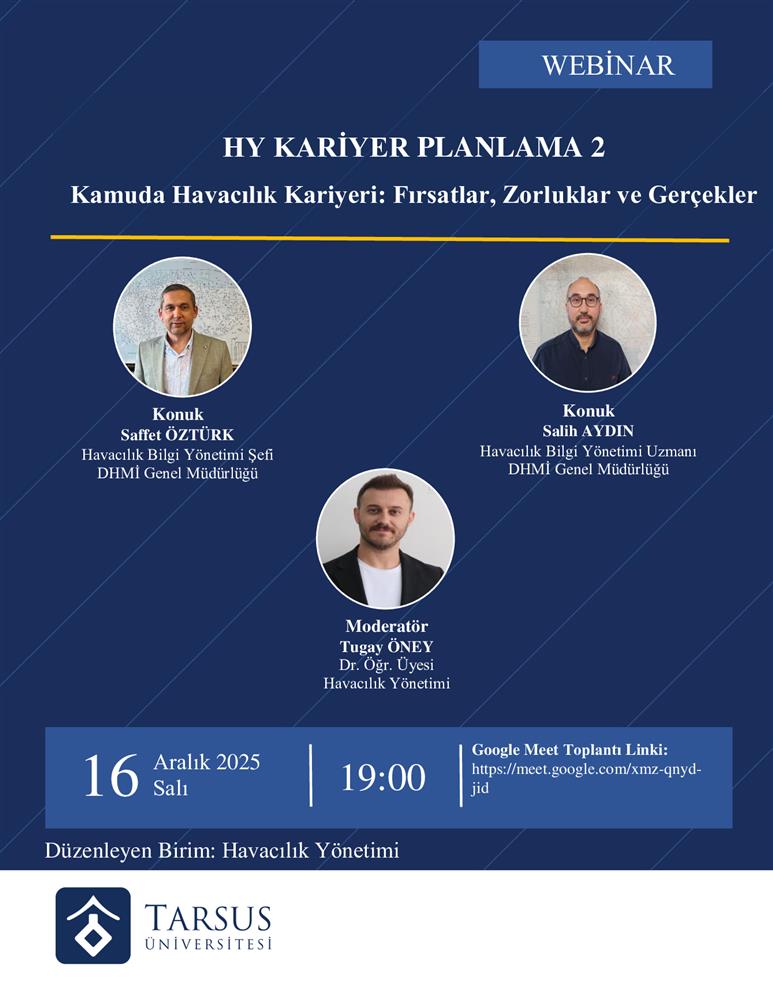 16 Aralık 2025 Salı günü saat 19:00'da çevrimiçi düzenlenecek olan "Kamuda Havacılık Kariyeri: Fırsatlar, Zorluklar ve Gerçekler" başlıklı söyleşimize tüm öğrencilerimiz davetlidir.